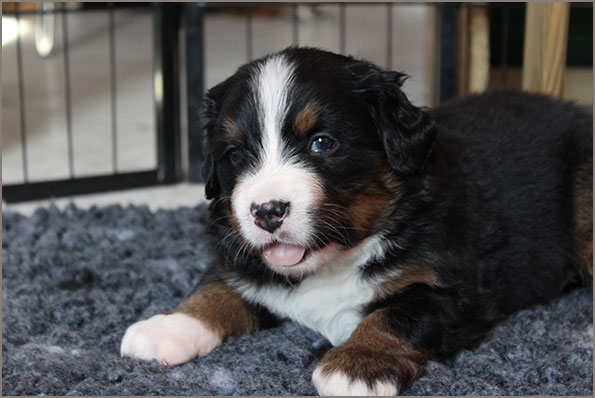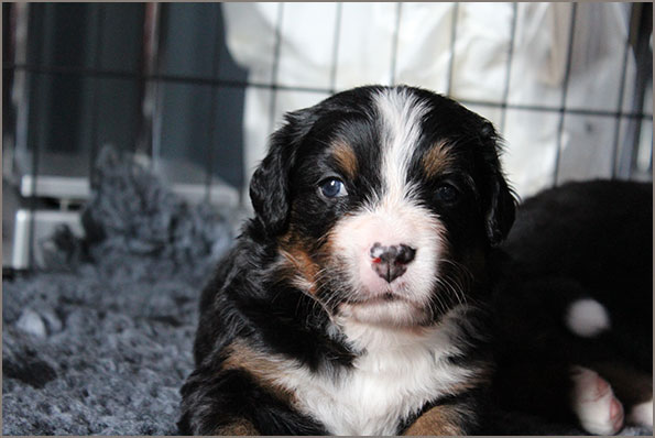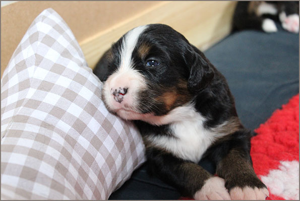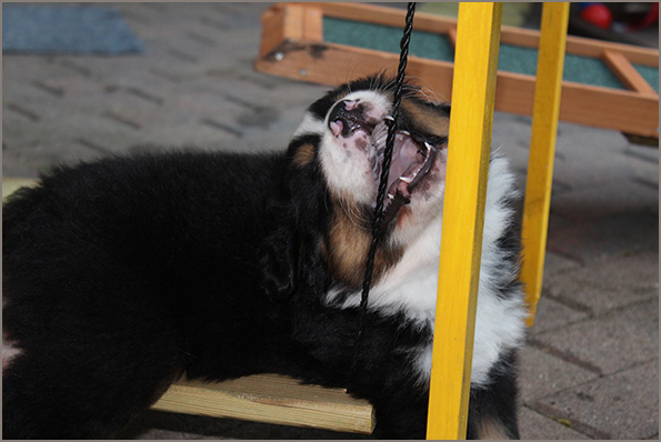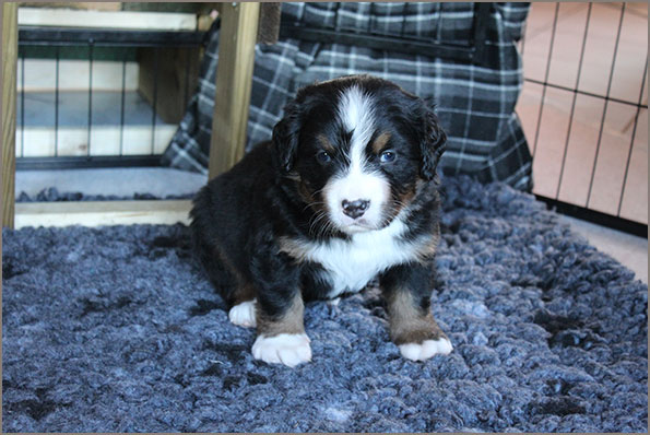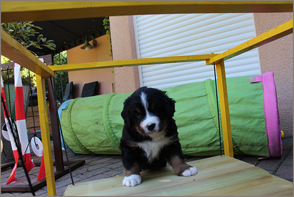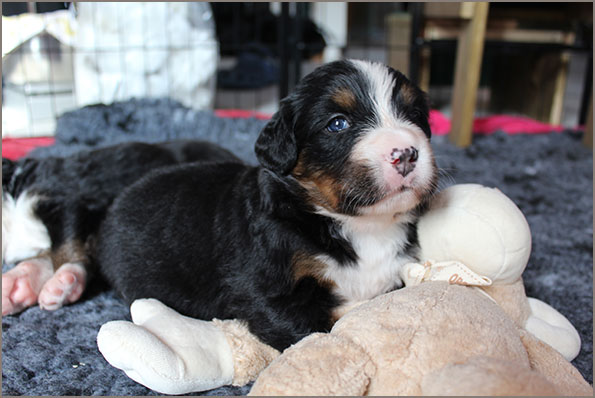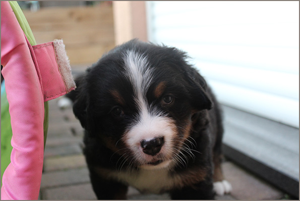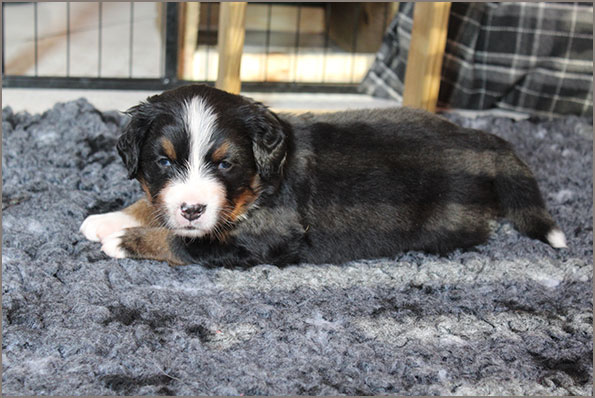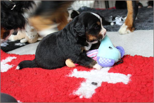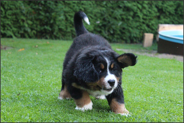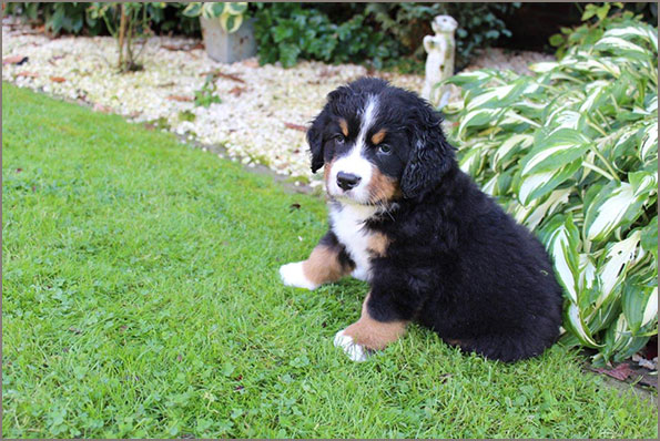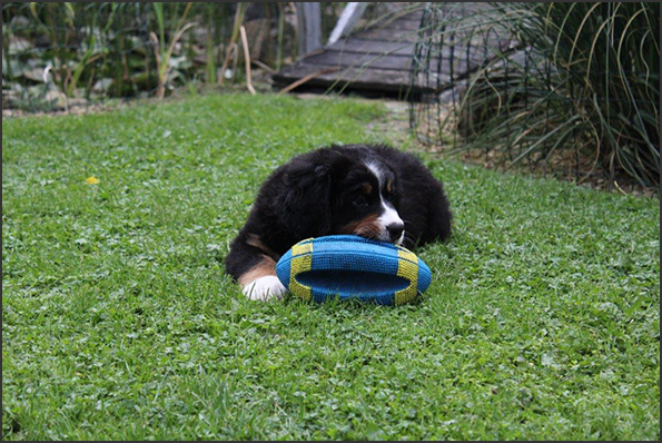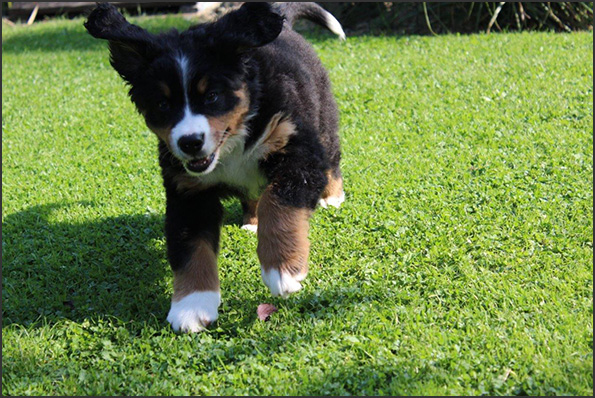 | Knapp 2jähriger, typvoller Rüde mit leicht gewellter, gepflegter Behaarung und dunklem Brand. Kräftiger Kopf, dunkelbraune Augen, leicht offene Lefzen, korrekte Ohrenhaltung, sehr kräftige Laufknochen, im Stand minimal ausdrehend gestellt. Ausreichende Winkelungen, Rücken minimal ansteigend, Rute korrekt getragen. flüssiges, freies, nocht etwas verspieltes Gangwerk, absolut freundliches Verhalten. |